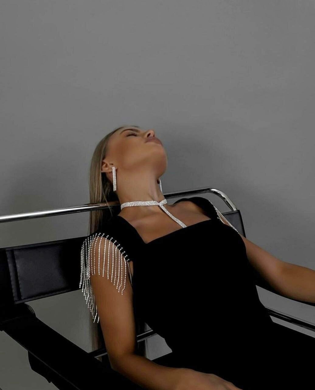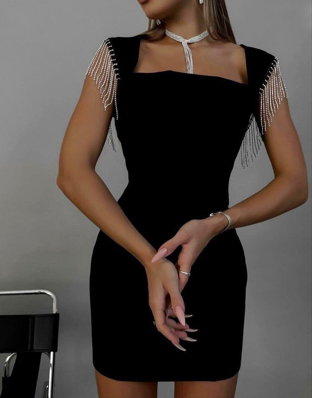 платье короткое прямое без рукава, украшено декоративной бахромой
