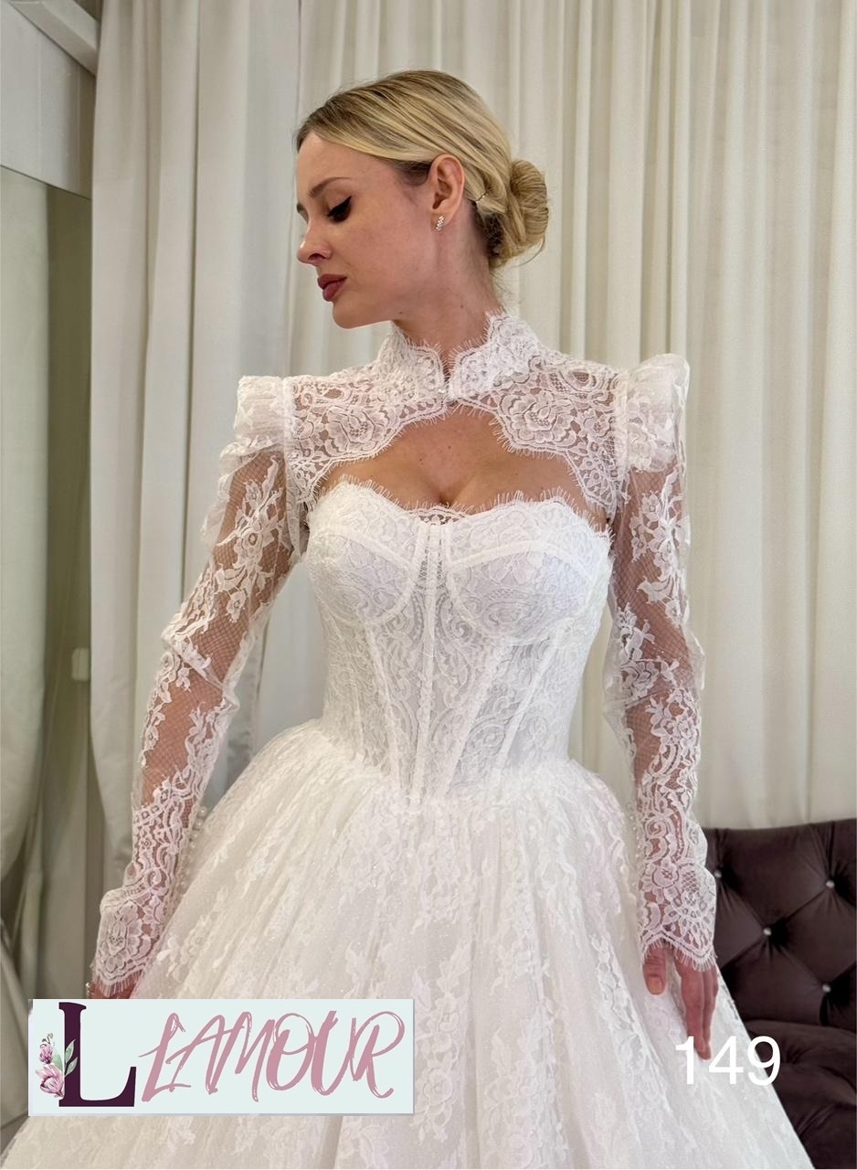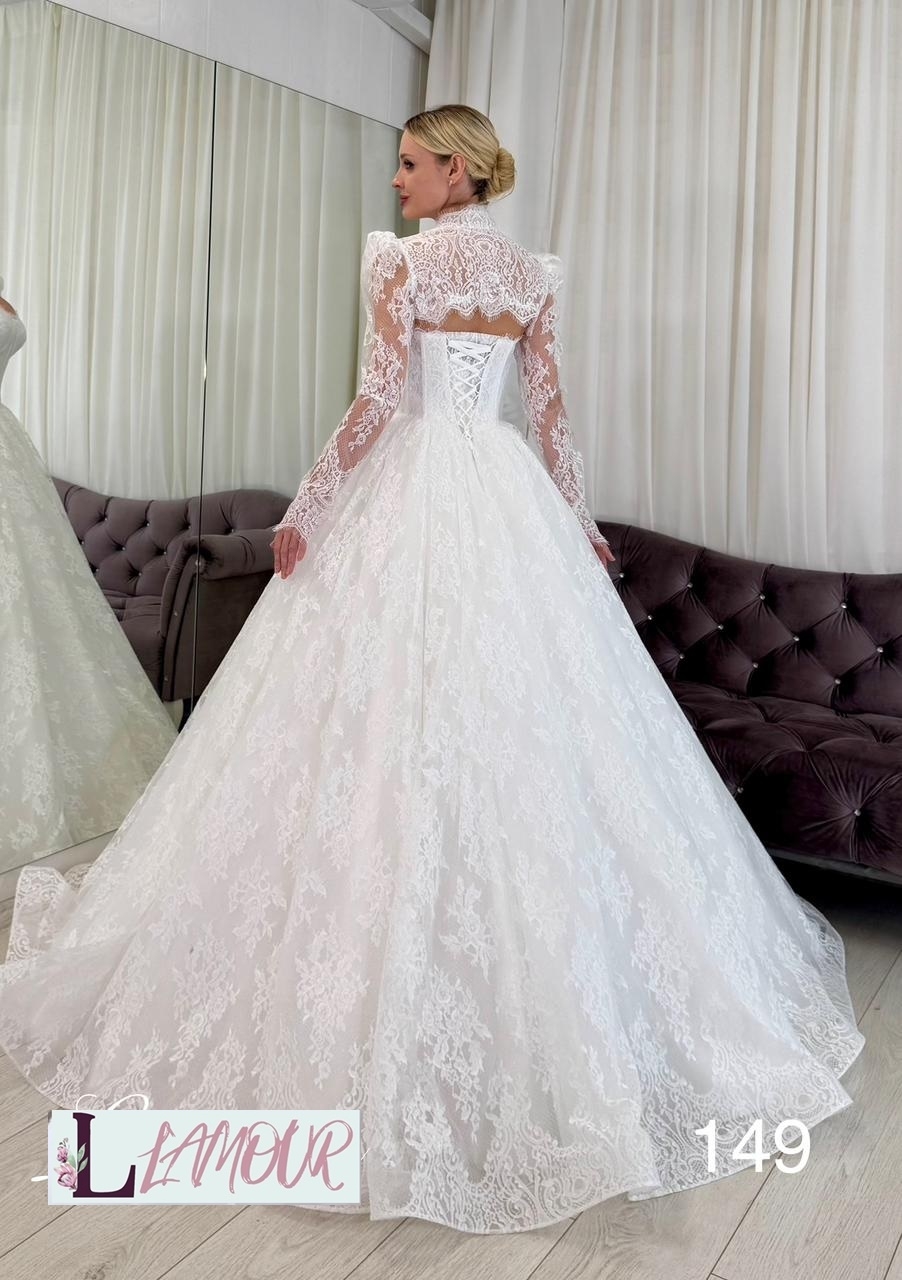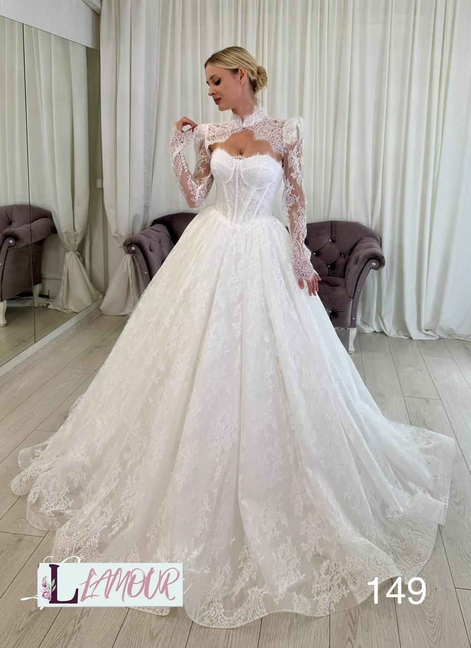 Шикарное пышное длинное платье. Декольте оформлено вырезом в форме сердца. Корсет из тонкого гипюрового кружева дополнен элегантными чашками болеро . Дополнительно к платью представлено легкое кружевное болеро с длинными рукавами. Верхняя половина спинки открыта. Длинная юбка из нескольких слоёв фатина сверху покрыта гипюровым слоем . Идеальным дополнением послужит длинная классическая фата.