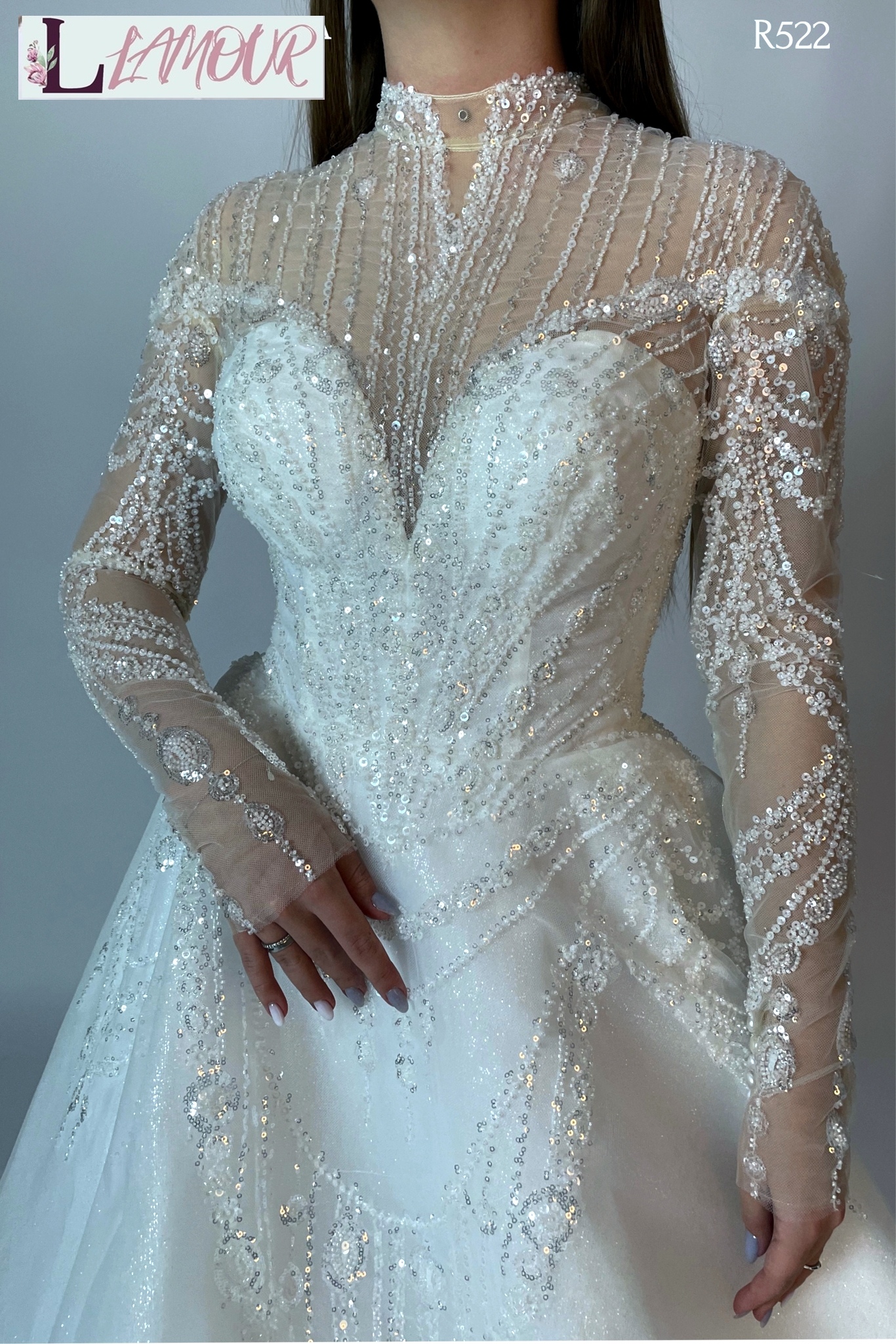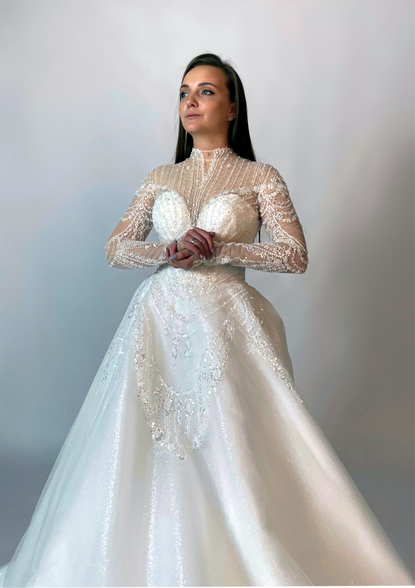 Закрытое свадебное платье с длинным облегающим рукавом, которые спускаются от плеч до запястий, придавая образу изящество и романтичность.. Лиф с прозрачным декольте и высокой горловиной украшен фактурной сверкающей вышивкой .
