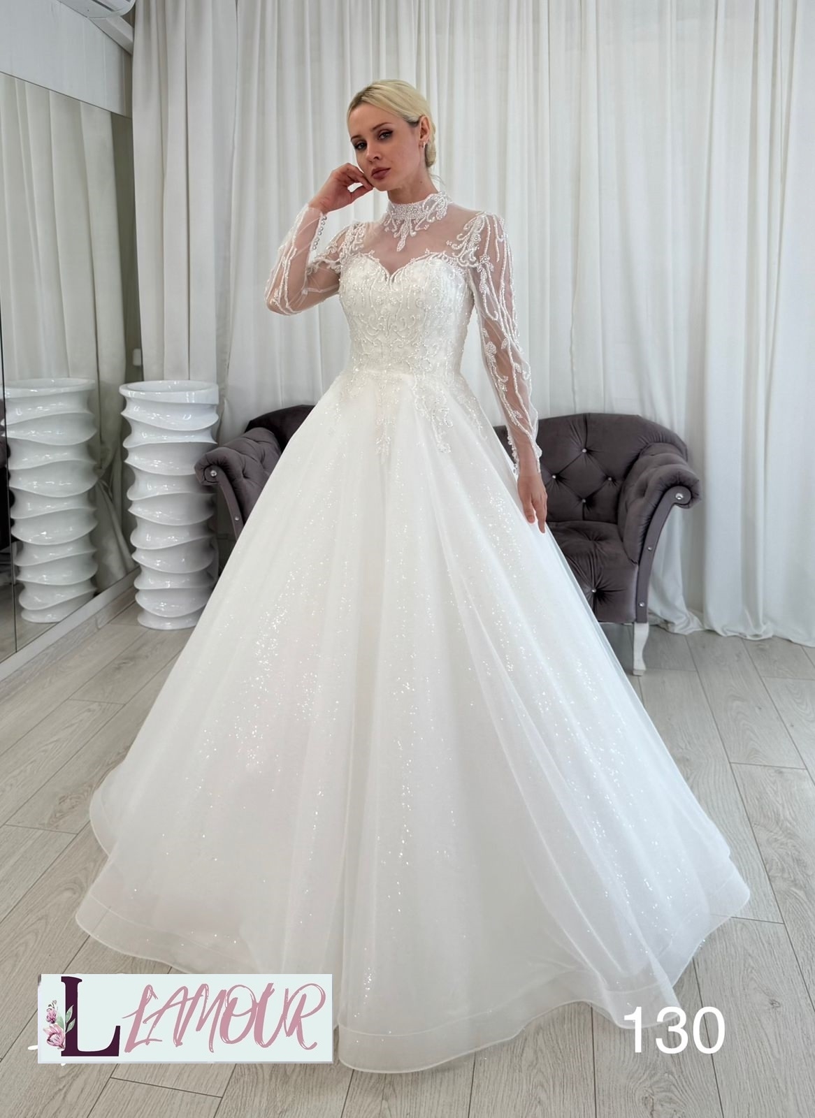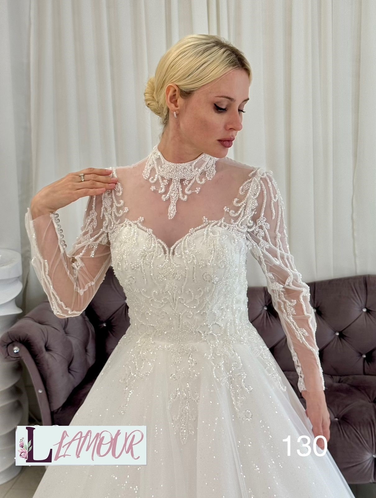 Длинное романтичное платье молочного оттенка в А-силуэте. Закрытое декольте прикрыто полупрозрачной тканью с кружевной отделкой и бусинами. Корсет с вырезом в виде сердечка декорирован небольшими бусинами и дополняется длинными рукавами с цветочными узорами. Спинка украшена вставкой из фатина с эффектным вырезом. Пуговицы-жемчужины служат застёжкой сзади. Юбка из нескольких слоёв мерцающего фатина украшена кружевными элементами из бусин и пайетками .