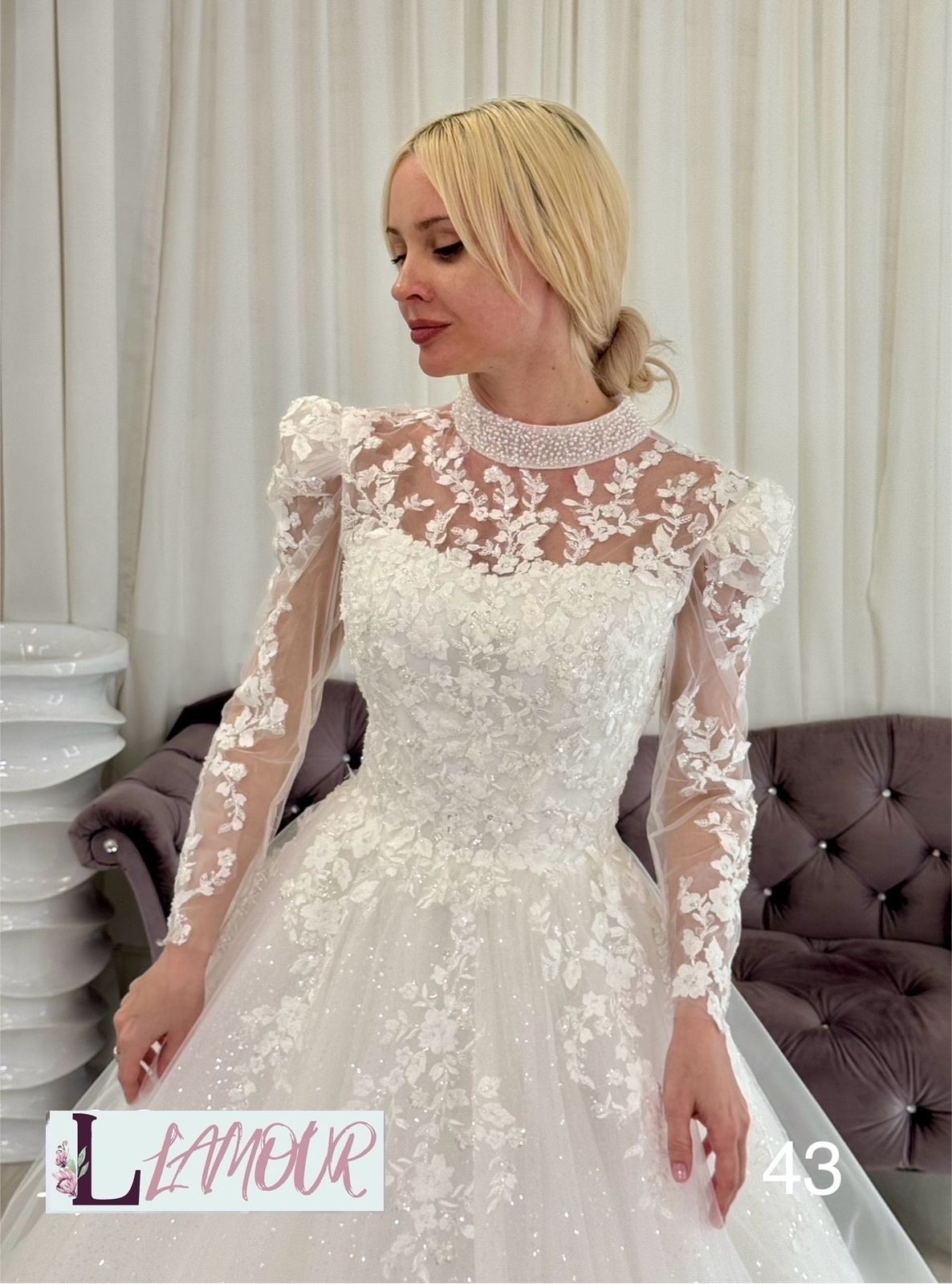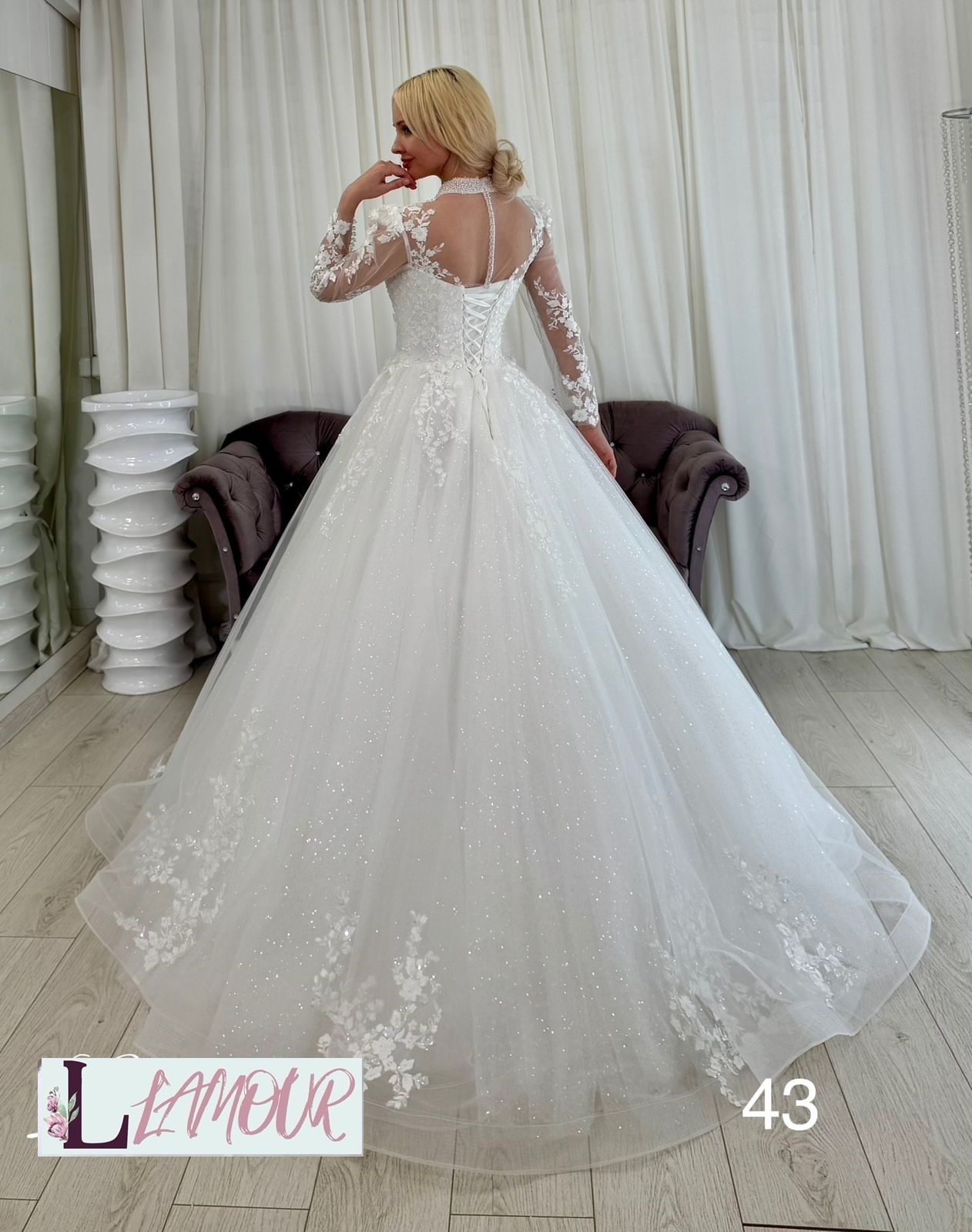 Роскошное свадебное платье с длинным рукавом. Лиф с высокой горловиной расшит великолепным узором в виде цветочных бутонов, которые спускаются на юбка .Многослойная юбка из невесомого фатина эффектно мерцает блестками и делает образ воздушным.