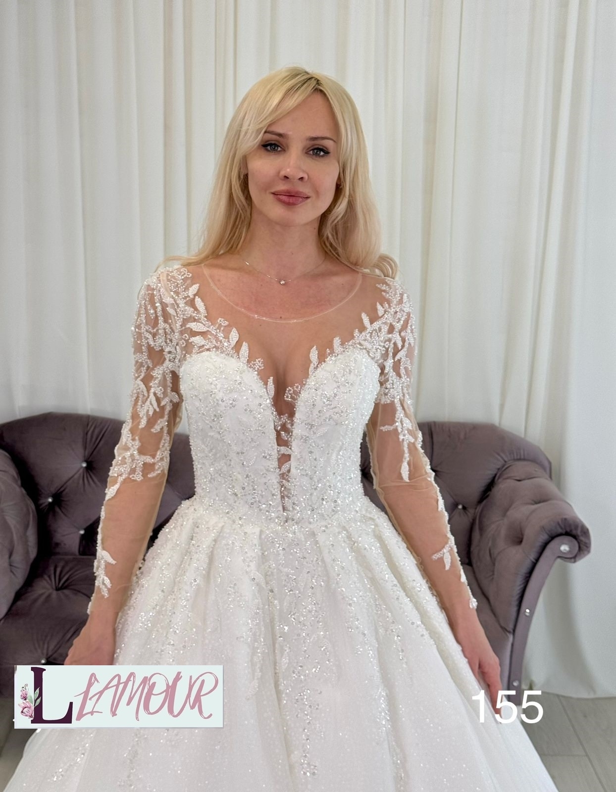 Длинное эффектное платье, выполненное в А-силуэте. Кружевной корсет с глубоким V-образным вырезом дополнен длинными рукавами с ажурными деталями. Застёжка выполнена на пуговицах сзади. Фатиновая юбка из нескольких слоёв, украшенная кружевом.