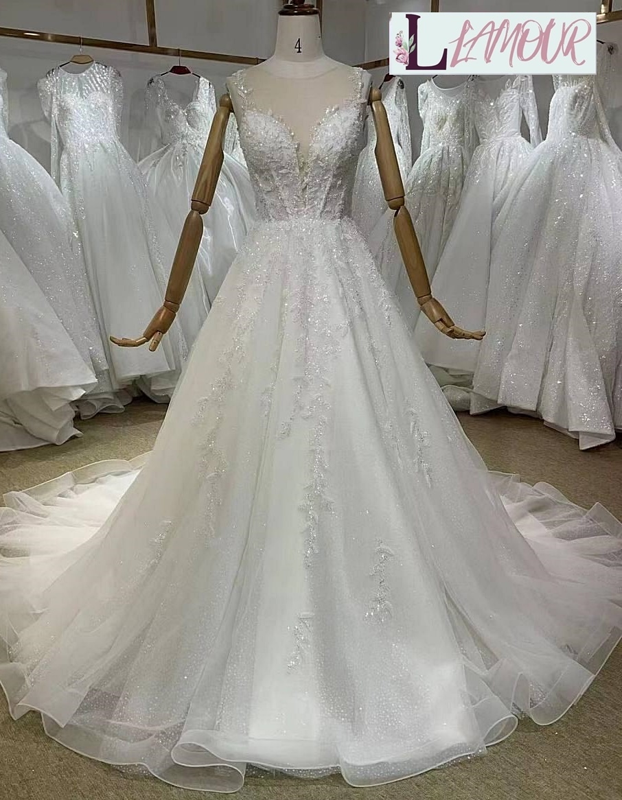 Длинное нежное платье А-силуэта без рукавов . Кружевной корсет с глубоким V-образным вырезом, украшенный цветочными элементами., которые переходят на юбку .Спинка остаётся частично открытой. Невесомая и сверкающая многослойная юбка из фатина расшита ажурными узорами