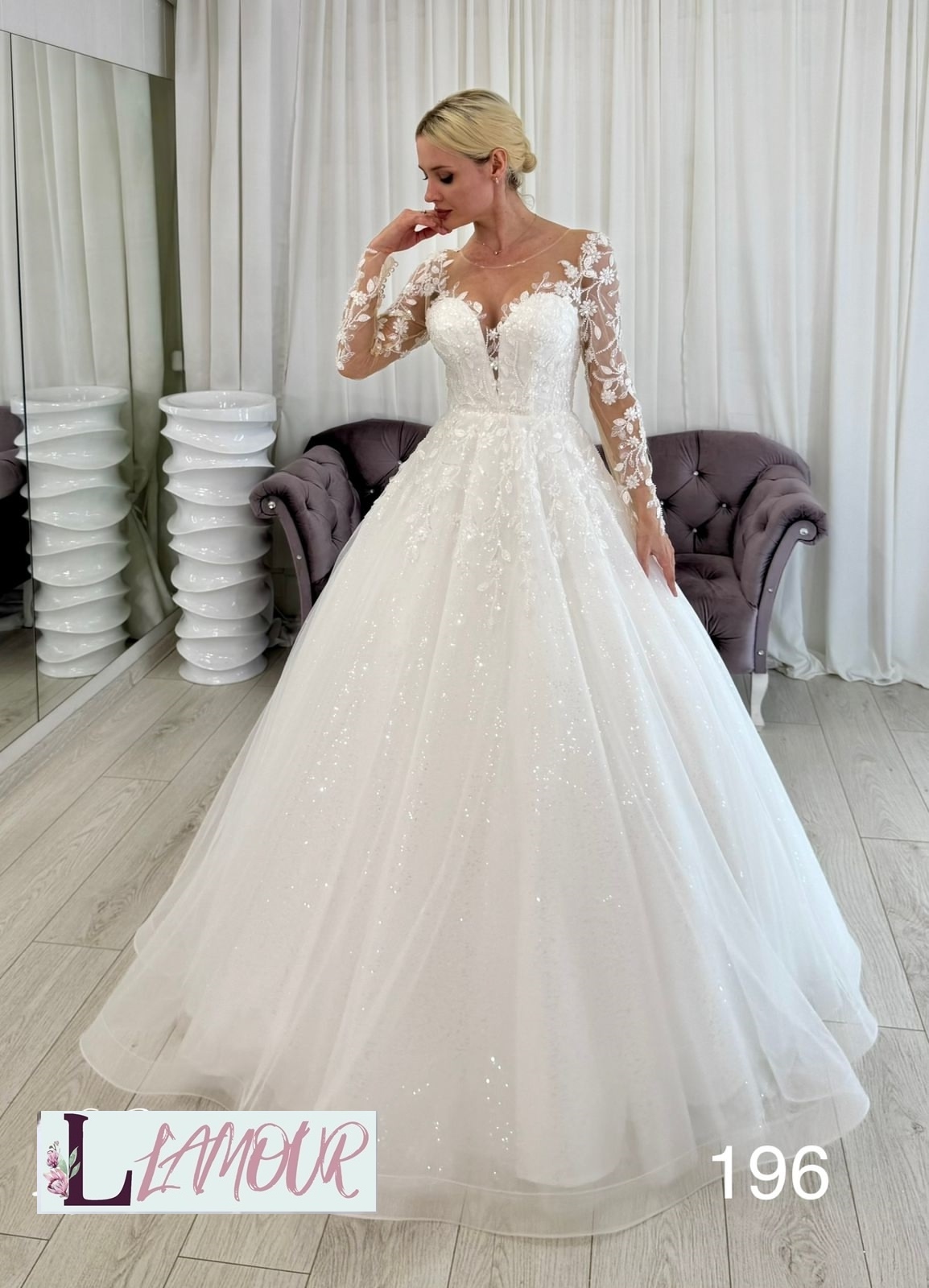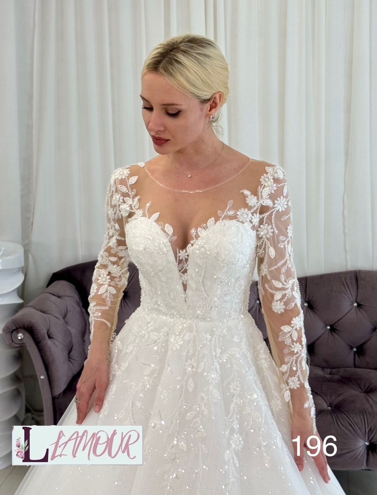 Длинное романтичное платье молочного оттенка в А-силуэте Корсет с вырезом в виде сердечка декорирован кружевной отделкой и пайеткой с бисером , дополняется длинными рукавами с цветочными узорами. Пуговицы-жемчужины служат застёжкой сзади. Юбка из нескольких слоёв фатина покрыта кружевной отделкой .
