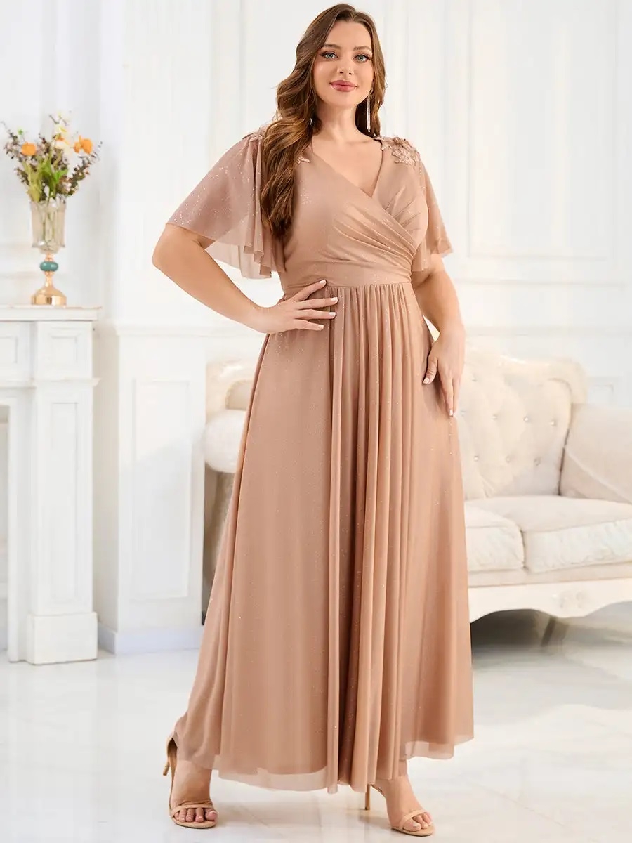 Вечернее шифоновое платье с V-образным вырезом и коротким рукавом. Корсет украшен аппликациями